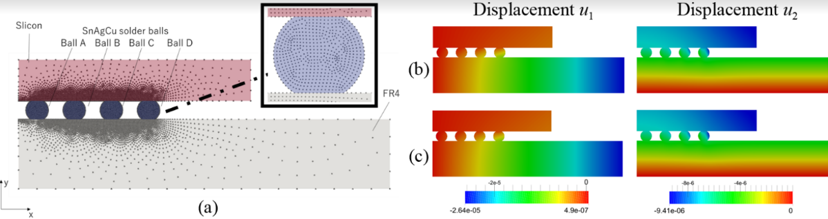 The complex multi-scale failure modes, damage evolution, and fragmentation resulting from high velocity contact-impact processes in solids and structures pose considerable difficulties in simulations using finite element methods. J. S. Chen is one of the original developers of meshfree Reproducing Kernel Particle Method (RKPM) for modeling material damage in fragment- impact processes. RKPM is formulated with state-of-the-art stabilization and variationally consistent methods, which ensures the stability, accuracy, and efficiency in the numerical simulation. The in-house Nonlinear Meshfree Analysis Program (NMAP) developed based on RKPM by Chen’s group has been successfully applied to the modeling of Empty Room Closure at the Waste Isolation Pilot Plant (sponsored by the Sandia National Laboratories) as shown in Fig. 1, where the shearband formation and damage accumulation associated with the closure of an underground disposal room (rock salt repository) under the natural compaction over hundreds of years are simulated. Funded by the National Research Council Canada, the RKPM capabilities have been applied to the simulation of reinforced concrete column under blast load as shown in Fig. 2, where RKPM simulation accurately captures the formation of diagonal cracks on the column’s shaft as well as the post-blast intense spalling as observed by the UCSD blast simulator. Sponsored by the National Science Foundation, Prof. JS Chen’s group has developed an efficient RKPM reduced-order modeling technique for the fast prediction of thermal fatigue behaviors of electronic devices as shown in Fig. 3, where only 2.62% computational time of the high-fidelity model is required with merely a lost of 0.7% accuracy.